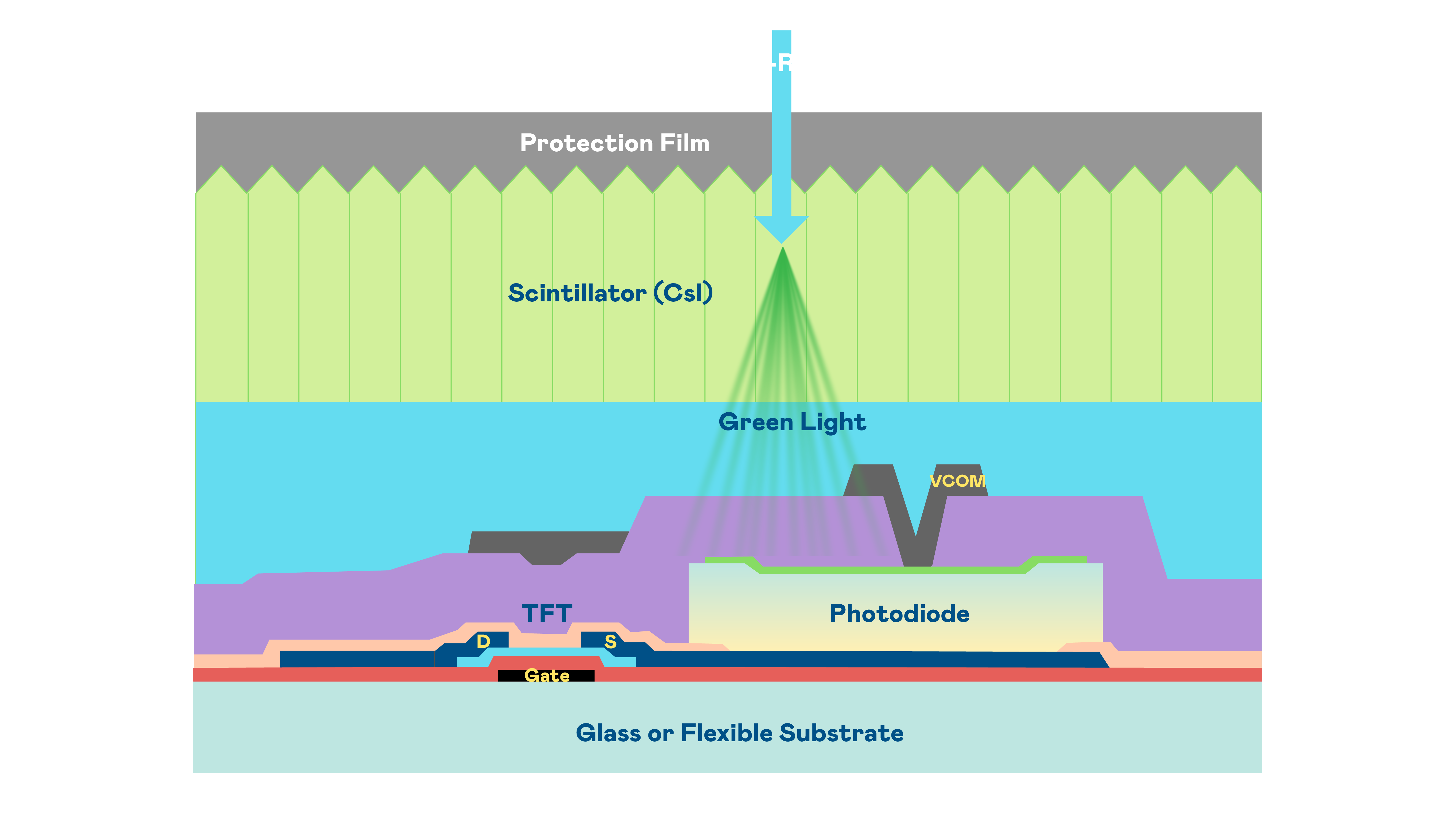 JJB电竞的X光影像感測陣列使用薄膜電晶體 (TFT) 作為每個像素的讀取開關,搭配光電二極體(Photodiode)的光電轉換元件,用以感測X光影像訊號。
